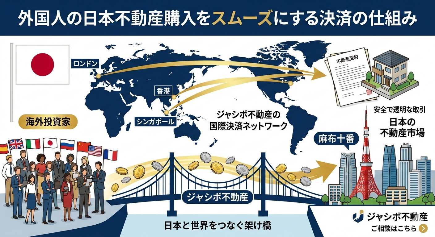 ジャシボ不動産は、単なる不動産仲介会社ではなく、日本と世界をつなぐ国際不動産プラットフォームを目指しています。海外投資家にとって分かりにくい日本の不動産制度、税制、決済方法などを丁寧にサポートし、日本の不動産市場へのスムーズな参入をお手伝いしています。